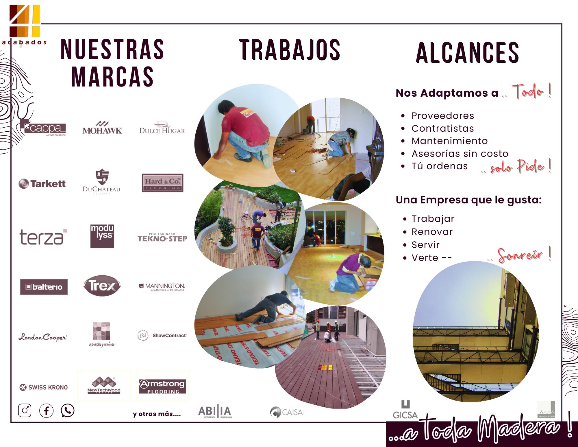 PISOS DE MADERA, ALFOMBRAS, VINÍLICOS, DE CUATRO ACABADOS, -4AKVA2- PISO LAMINADO, PASTO SINTÉTICO, DECKS CUMARÚ, IPE, TECA, EMPRESA CUATRO ACABADOS (4AKVA2) TE OFRECE LOS SERVICIOS DE: -VENTA, SUMINISTRO E INSTALACIÓN PISOS -SUPERVISIÓN DE OBRA -MANTENIMIENTO -ASESORÍAS GRATIS AL 55 34 15 47 97. PISOS LAMINADOS, INGENIERÍA, DECKS, PÉRGOLAS ARTESANALES,PASTO SINTÉTICO, PISOS VINÍLICOS, MUROS VERDES, MANO DE OBRA CALIFICADA Y SUPERVISADA POR ARQUITECTOS, -RECUERDA- LA CALIDAD NO CUESTA, ES GRATIS !. -TENEMOS MÁS DE 30 MARCAS COMO : -TERZA -TEKNO-STEP -DULCE HOGAR -DUCHATEAU -HARD &CO -ETC.